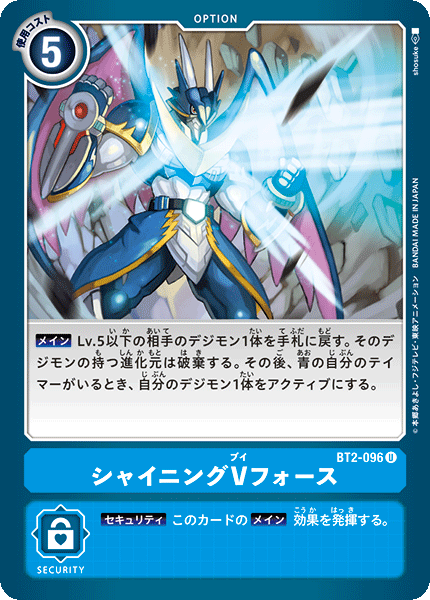 【主要】將對方1隻Lv.5以下的數碼寶貝放回手牌。廢除該數碼寶貝所持有的進化元卡。之後,場上存在我方藍色馴獸師時,將我方1隻數碼寶貝置為活動狀態。